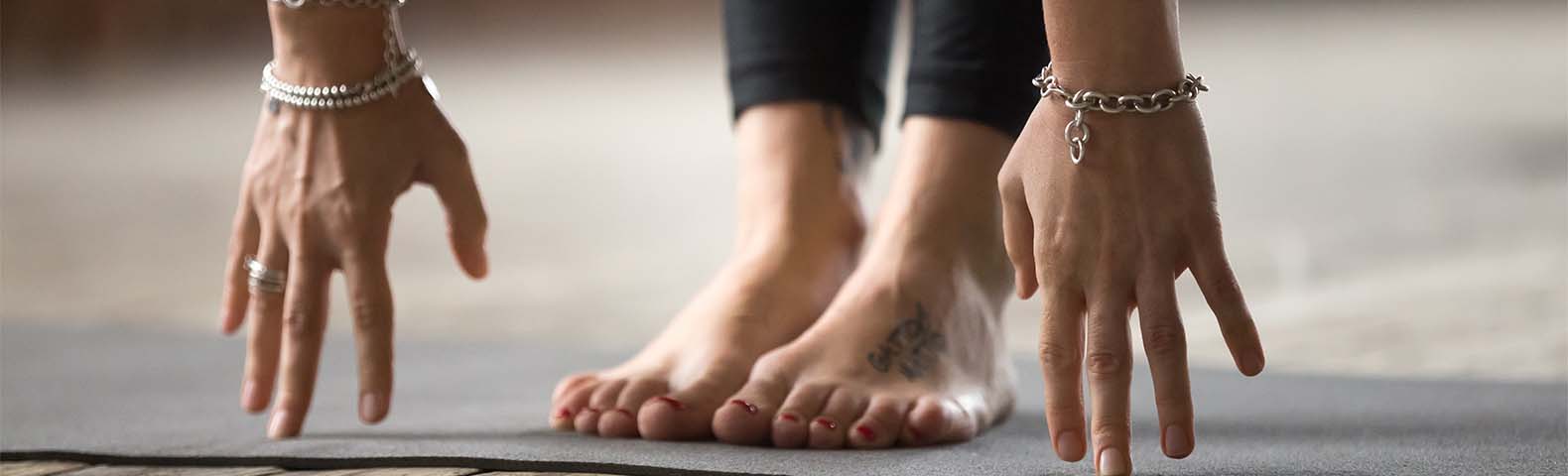 - Start by standing with your feet shoulder-width apart and slowly bend forward from the waist – keep your legs as straight as possible and don’t bounce